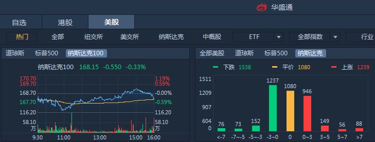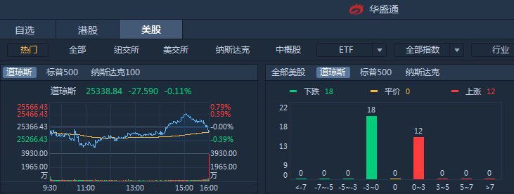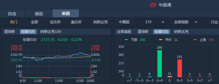 受国际消息影响,周四美股三大股指集体收跌,标普500指数收跌0.22%,道指收跌0.11%,纳指收跌0.25%。