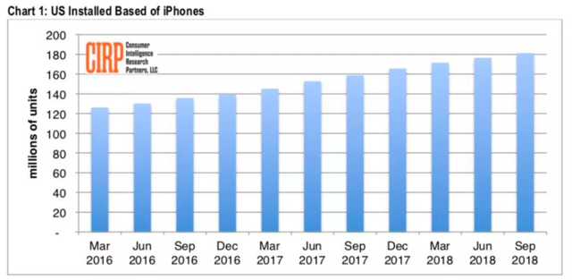 我们知道,苹果的销量已经停滞了很长一段时间。然而,该公司的整体用户基础仍在以健康的速度增长。蒂姆•库克在财报中提到,公司在iPhone正在使用的数量(Installed Base)上仍实现了两位数的增长。最近的CIRP报告显示美国的iPhone在用数量从去年同期的不足1.6亿增长到1.8亿。这个数据可以测量正在使用的所有iPhone数量,从整体上看是一直增长的,也间接说明了苹果庞大的二手市场。这个庞大的基数无疑是发展服务业务的良好基础。