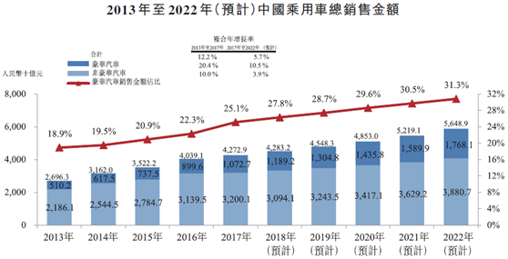 豪华汽车市场方面,基于汽车金融服务普及率增长,降低购车门槛;受惠于我国2018年7月1日乘用车进口税下调至15%,进口车关税的下调将推动市场的发展。预计我国豪华汽车销售价值与2022年增长至17681亿元,复合年增长率为10.5%。