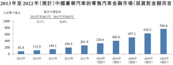 豪华汽车市场方面,总贷款金额从2013年的834亿元到2017年增长到2614亿元,年复合增长率达33.1%。在需求增加且多元化贷款接受度上升的促进下,预计该市场市场规模在2022年达到7664亿元。