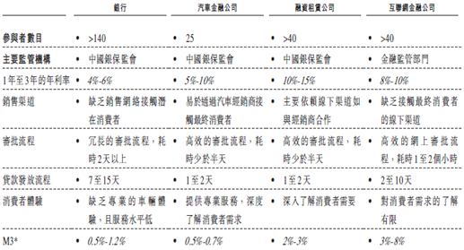 竞争格局方面,汽车金融市场目前主要参与者为商业银行、汽车金融公司、融资租赁公司及互联网金融公司。传统上,商业银行在汽车金融业务中占有优势;但汽车金融公司逐渐占据越来越多市场份额,成为零售汽车金融市场中最大的参与者群体。2017年,就贷款金额而言,汽车金融公司约占零售市场的57%。