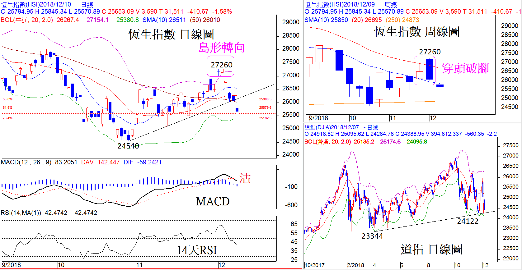 從日線圖看,恆生指數上周四、五都跌穿了20天保力加通道中軸線支持低收,今早即以下跌裂口失守了24540底部延伸的上升軌支持,跌勢有增無減。後市有機會考驗現時位於25380的通道下限線支持。指標方面,MACD剛回復沽售訊號,而RSI現已跌至42的弱勢區,顯示恆指的跌勢方興未艾,暫時看不到有任何見底的跡象。