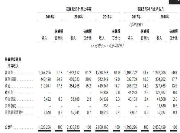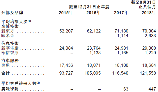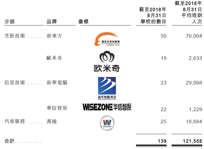 公司拥有知名的新东方烹饪学校,其他5大品牌包括欧米奇西点西餐教育、新华电脑教育、华信智原DT人才培训基地、万通汽车教育和美味学院,新东方烹饪和欧米奇西点西餐分别针对中国传统菜肴及高质量西式餐饮,美味学院为公司17年新成立的私人订制烹饪培训服务;新华电脑教育和华信智原针对信息技术培训,万通汽车教育侧重汽修、汽车商务及其他汽车服务培训。此外,公司亦通过25所学校提供职业中专学历教育。