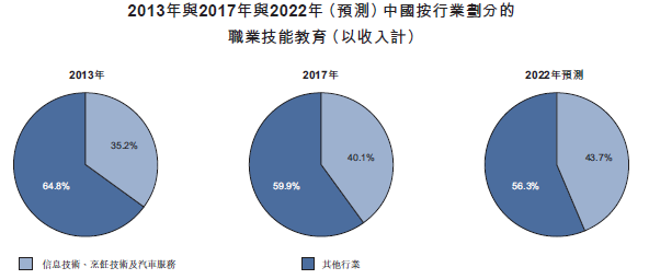按细分行业收入计算,公司经营的烹饪技术、信息技术及汽车服务占职业技术教育总市场比例逐年提升,从13年的35.2%增至17年的40.1%,主要来源于就业市场需求的提升,到2022年有望增至43.7%。具体看,2017年至2022年三大细分市场收入的年复合增长率分别为9.9%、12.7%及12.6%。