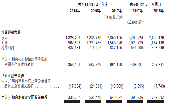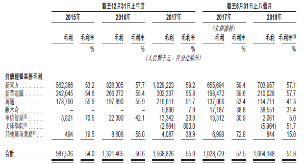 整体业绩方面,受益于平均培训人次提升及收费增长,集团持续经营营收、毛利及利润与全面收益总额均有大幅增长。公司通过收取预缴培训学费及服务费获取收入,2015年至2017年营收分别为18.28亿元、23.36亿元和28.50亿元,年复合增长率为24.9%;净利润分别约3.53亿元、5.87亿元、6.61亿元,年复合增长率39.5%。