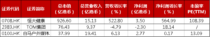 公司是新三板上市公司的子公司,收入占母公司总收入接近八成。目前公司在新三板上的估值约为80倍。另一方面,作为广告公司,跟同类港股相比较,如下图所示,各公司收入波动较大,估值分布比较分散,至于汇量科技能够获得多高的估值还有待上市检验。