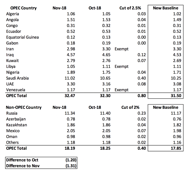 公报显示,OPEC将在2018年10月的基础上每日减产80万桶石油,减产有效期为6个月。除了OPEC组织减产80万桶外,以俄罗斯为首的非OPEC组织产油国将减产40万桶,减产时间和期限相同,这就意味着OPEC+将在2019年上半年减产120万桶/日。各家减产估算如下图,OPEC产油国日产约3150万桶。