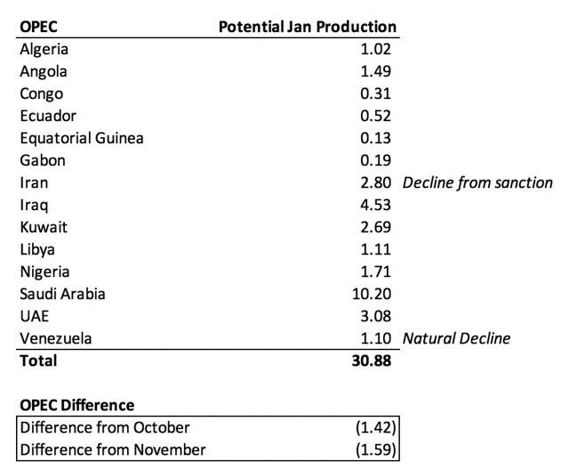 两者合计对应的减产效果如下图,相比10月份每日减产约158万桶,相比11月日减169万桶。以上结果假设截至19年4月俄罗斯并不会开始减产。值得注意的是,18年11月沙特日产增加至1100万桶,伊朗日产从330万桶降至300万桶。笔者预计,到19年1月伊朗日产将降至280万桶或者降至上一次制裁期的产量水平。综上,预计19年1月OPEC日产总体减至3088万桶。