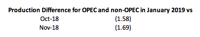 整体来看,相比10月水平,19年1月的减产效果高至每日158万桶,不过,该预期取决于伊朗产油的减产速度,笔者认为,19年原油供应过剩的程度及影响被过度夸大。另外,尤其是非OPEC国家产油仍有较大调整空间,导致减产效果不及预期。