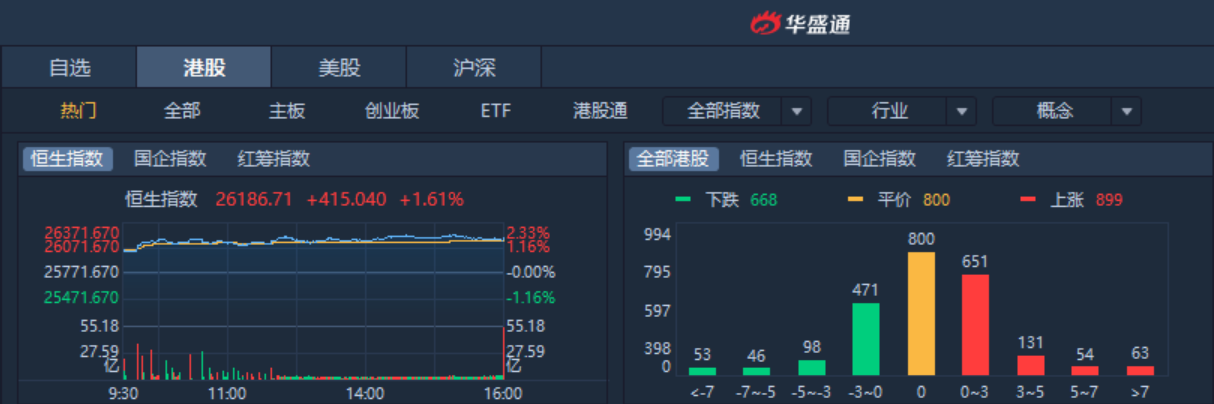 周三恒指早盘收复两万六关口,高开1.1%,报26054.01点。截至收盘,恒生指数涨415.04点或1.61%,报26186.71点,全日成交额达694.97亿。