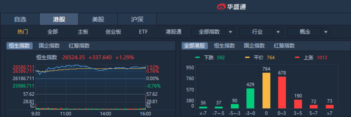 由于中美贸易紧张局势缓,昨日港股高开231点,报26417点,之后一路震荡向上,截至收盘,恒指收涨1.29%,报26524点,主板成交793.1亿元。