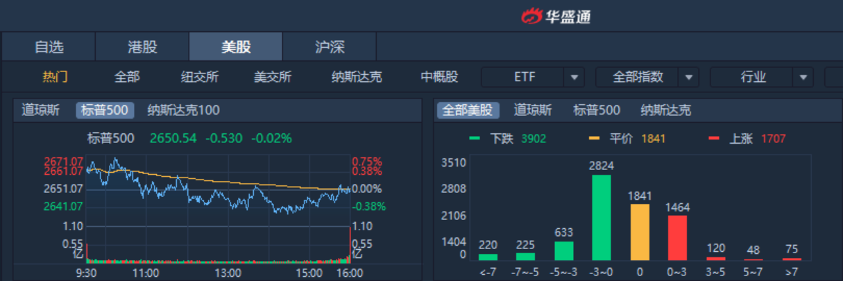 周四,美股高开低走,三大股指收盘涨跌不一,标普500收跌0.53点,跌幅0.02%,道指收涨70.11点,涨幅0.29%,纳指跌27.98点,跌幅0.39%。