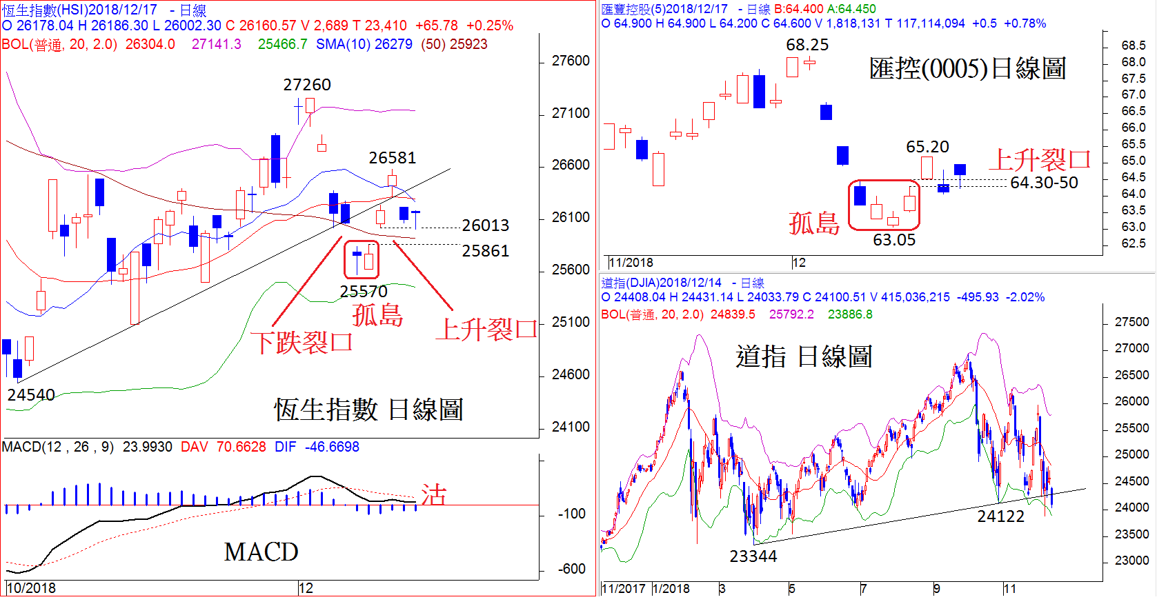 究竟恆指是否已在26581完成反彈,相信要視乎25861至26013之間的支持區會否失守,此乃12月12日形成「島形轉向」底部之後的上升裂口。恆指若然沒有完全回補這個裂口支持區,則表示「島形轉向」底部所產生的利好作用仍未消散,大市短期內將逐步回升。相反來說,如果完全回補25861至26013之間的上升裂口的話,則表示12月12日形成的「島形轉向」形態已被否定,繼而增加恆指已在26581結束反彈的可能性。