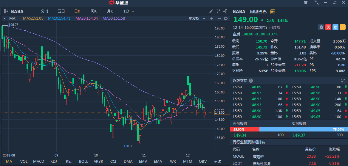 作为知名中概股,电商巨头阿里巴巴(BABA)股价波动与中美贸易冲突的升级与改善息息相关。自G20两国元首会谈后,加税日期延后至19年3月1日。据CNBC报道,近期美贸易代表Robert Lighthizer表示该日期是最后期限,逾期后将进行加税。与此同时,SEC声明称阿里百度京东等中国上市公司存审计风险,最近华为CFO被捕事件也为谈判增加压力。