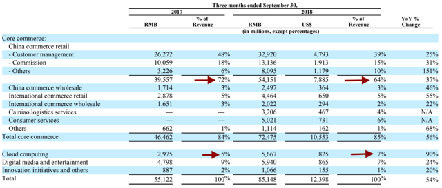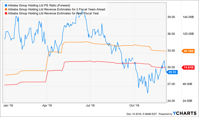 不仅如此,公司大股东软银在全球作了广泛大量的投资,常投资有益于公司拓展计划的初创企业。正因为如此,公司减少对核心电商收入的依赖,其营收占总营收比例开始下滑,从上一年的72%降至近期的64%,且国外商业零售增速55%远高于国内增速。于此同时,云计算业务则不断提升,比例从5%增至7%。如此往后,可以起到公司到2020年业务更多元化,所承担的贸易战负面压力将会减少。
