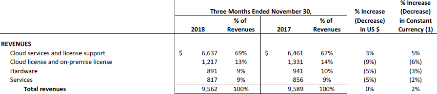 分析业务分部,传统授权业务、硬件及软件业务收入均同比下滑,占总收入比例持续下降,Q2则降至31%,三项收入同比下滑6.2%,但扣除汇率影响后只有小幅下滑。受益于公司的云业务转型,利润率更高的云服务及授权支持业务收入占比从67%提至69%,不计汇率影响则收入同比大增5%至66.4亿美元,增长明显高于总体业务增速。电话会上,管理层表示两大云EPR业务(Fusion ERP与NetSuite ERP)季度增速达到32%,公司成为云EPR领域的龙头。