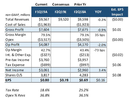 Q2总营收956亿美元,同比基本持平,排除利率影响则同比增长2%,比分析师预期高出4千万美元;季度净利润23.33亿美元,同比增长5%。Non-GAAP净利润则同比增3%至30.61亿美元,对应EPS为0.80美元,接近管理层预期0.78至0.80美元的高位,比分析师预期高0.02美元,不计汇率影响则同比大增19%。对比上两个财年,公司季度业绩越趋稳定,营收EPS多超预期。此外,公司还宣布每股季度派息0.19美元。
