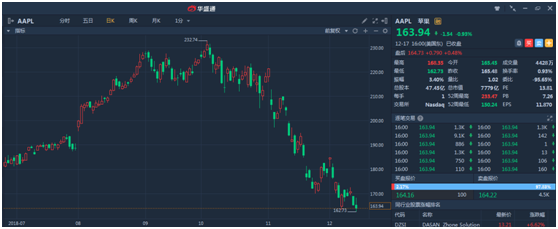 昨夜美股收盘三大股指跌幅均超2%,苹果下跌0.93%,股价跌至163.94美元。从10月高点的232美元,苹果已经下跌28%,尤其是在11月财报发布之后,由于管理层的悲观预期,公司股价加速下跌。