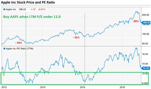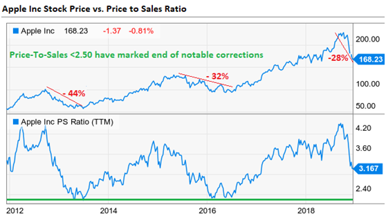 目前苹果市盈率为14.16倍,低于今年9月最高点20.4倍,略微低于公司5年和10年平均市盈率15.5倍。但以目前的市场环境,结合公司历史下跌过程,可以发现,公司的每次调整市盈率都低于12倍,因此投资者可以把该水平看成是公司的底部区域。如果以目前的盈利状况来判定,12倍的市盈率意味着公司股价将达到142.59美元。
