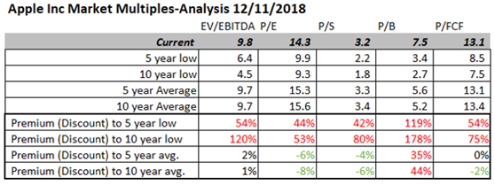 下表总结了苹果目前与5年及10年平均水平以及最低水平的估值差异,可以看出,相对于平均水平,公司估值总体还是较为合理,但若考虑历史低点,公司股价仍有下跌空间。由于未来市场的疲软,公司业绩可能受到影响,公司的估值水平下降可能会延续到明年。