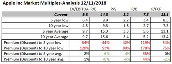 下表总结了苹果目前与5年及10年平均水平以及最低水平的估值差异,可以看出,相对于平均水平,公司估值总体还是较为合理,但若考虑历史低点,公司股价仍有下跌空间。