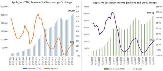 目前苹果市盈率为14.16倍,低于今年9月最高点20.4倍,略微低于公司5年和10年平均市盈率15.5倍。但以目前的市场环境,结合公司历史下跌过程,可以发现,公司的每次调整市盈率都低于12倍,因此投资者可以把该水平看成是公司的底部区域。