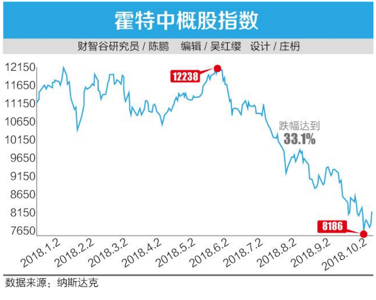 霍特指数显示(霍特财务集团编制的中概股行情的指数),中概股指数从6月的最高点12238点一路下挫至10月底的8186点,跌幅达到33.1%。