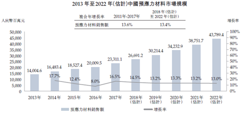 预应力材料市场由于十二五规划收尾阶段,因此在2015-2016年增长率放缓,随着十三五规划的展开,预计市场将重拾升势,2018-2022年复合增长率为13.4%。