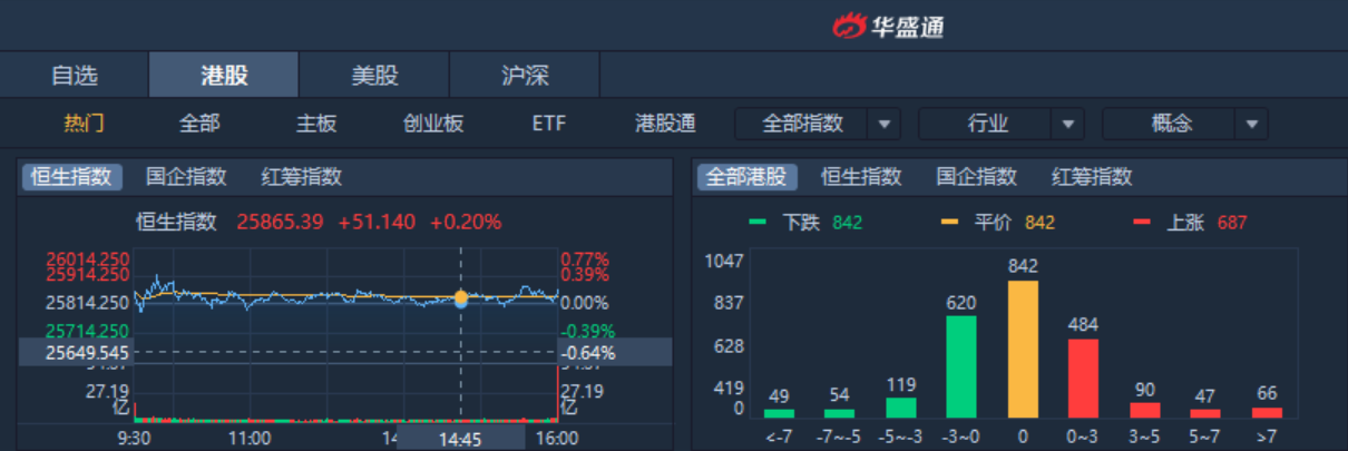 周三恒指早盘高开0.18%,报25860.68点,收盘涨51.14点,涨幅0.2%,报25865.39点,全日成交额为571亿。