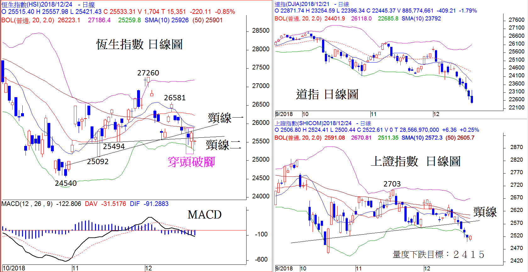 值得留意的是,出現「破腳穿頭」見底形態的位置,剛好是20天保力加通道下限線,而時間則剛好是節氣「冬至」的前一個交易日,所以不排除25313為短期底部的可能性。然而,以下的訊號或情況都一致向淡,暫時看不到恆指有大升的條件,極其量只是較大幅度的反彈而已: