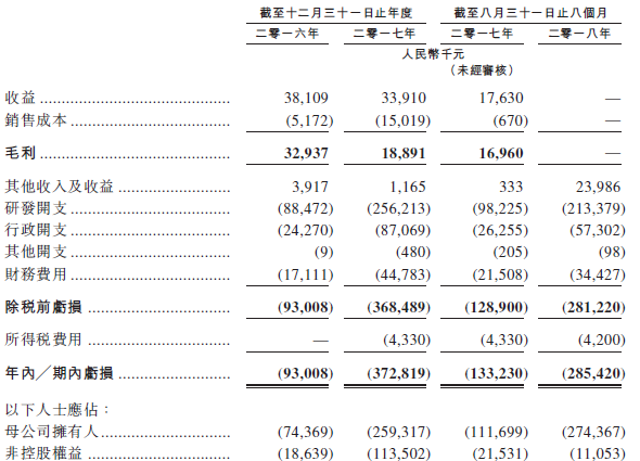 收入方面,公司所有产品均处于在研或者临床试验阶段,未有产品上市销售,目前收入主要来自许可费收入及第三方服务。16年、17年营收分别为3811万元、3391万元,今年前8个月数据不详,上年同期营收为1763万元。盈利方面,公司亏损逐年扩大,16年、17年、18年前8个月归母净亏损分别高达7440万、2.59亿、2.74亿。