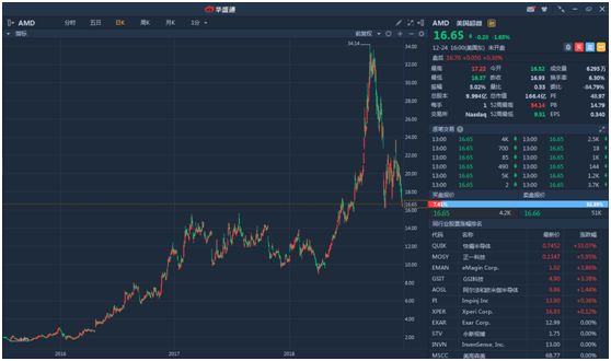 从2016年至今的3年里,AMD最高涨幅10倍;但在9月创造历史最高点34.14美元之后,公司股价开始下跌,一个月时间股价接近腰斩。