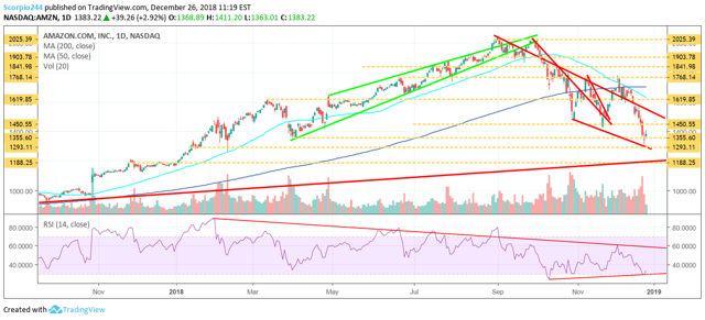 技术面看,当前位置很可能接近底部,1293美元附近有支撑。此外,股价创新低时,RSI指数开始有上涨趋势,呈现看涨背离情形,意味着未来几周开始向上趋势。在18年1月超买水平的情况下达到顶点后,RSI持续下滑。未来若RSI继续提升,可能意味着长期向上趋势的开始。