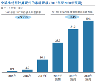 挖矿可以由一般电脑完成,但专门的BPU则更为高效。市场对比特币BPU的需求受到比特币价格、挖矿奖励以及BUP性能和成本的影响。随着加密货币吸引力的扩散,全球比特币硬件销售额从2015年的9亿人民币激增至2017年的101亿人民币,复合年增长率达到243.5%,预计到2020年规模达到408亿元,复合增长率达59.4%。