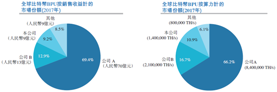 目前全球比特币BPU由国内三大BPU生产商主导,全球总收益及算力于2017年已经超过90%。按全球销售收益计算,公司为世界第三大比特币BPU生产商,市场份额为9.2%;按全球已售算力计算,公司市场份额为10.9%,同样排名第三。