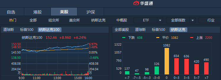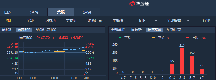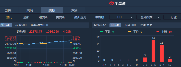 周三,美股强势反弹,道指涨4.98%,道指历史上首次收盘涨幅超过1000点;纳指涨5.84%;标普500涨4.96%。