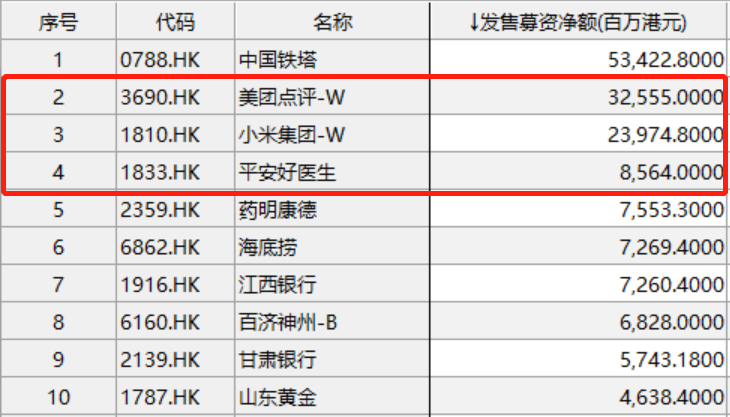 而从募资额前十的新股看,中国互联网公司无疑都占据了一个举足轻重的地位——港股市场中,美团、小米、平安好医生的发售募资净额占到TOP10总额的41%。