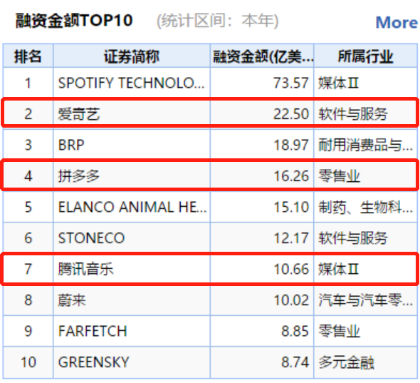 美股市场中,爱奇艺、拼多多、腾讯音乐的融资金额占到TOP10总额的25%(这里主要是SPOTIFY一家就募了74亿美金,占了近1/3,泡沫感人)