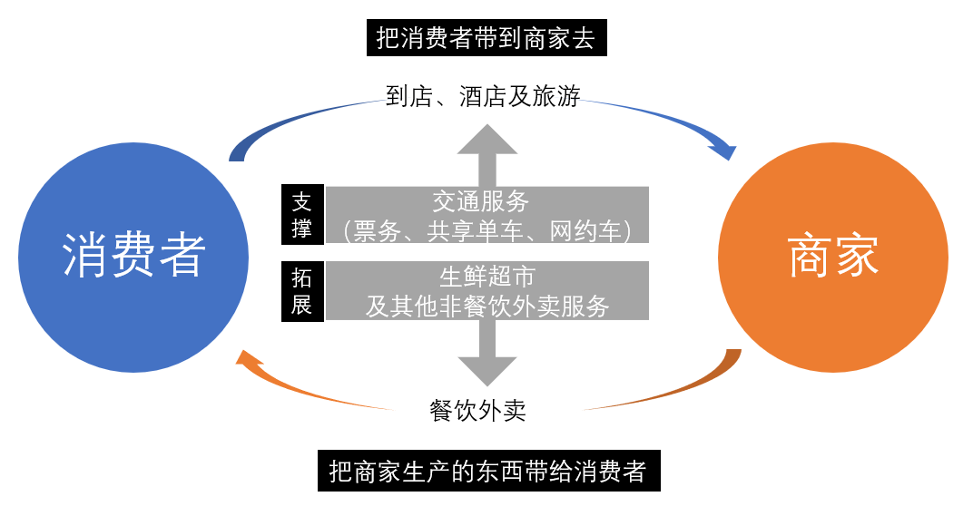 作为电商平台,美团所做的事情也是连接B端(服务提供商)和用户。但服务电商平台和实物电商平台之间还是存在微妙的区别——由于服务有着无法库存、即时使用、对地理位置敏感等特点,所以连接的方式存在两种。一是把商家生产的东西带给消费者(餐饮外卖为主),二是把消费者带到商家去(所谓到店业务)。