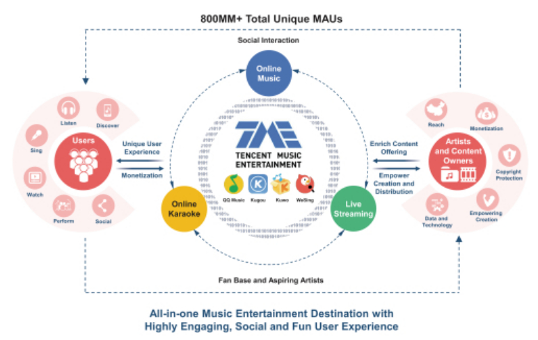腾讯音乐是目前中国最大的流媒体音乐娱乐平台。按月活跃用户数计算,截至2018Q2,腾讯音乐拥有中国前四大音乐Apps(QQ音乐, 酷狗音乐, 酷我音乐和全民K歌),并通过这些平台提供了在线音乐、在线卡拉OK和以音乐为中心的直播服务。