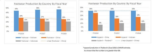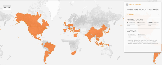 不过,值得注意的是,公司供应链管理出色,各地区分布比较平衡,如下是设有生产工厂的国家分布图。目前,生产仍集中在几个亚洲国家,鞋类生产中国仅占26%,自16财年以来比例持续下滑。