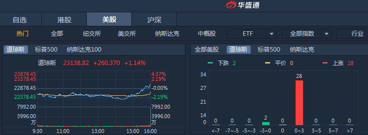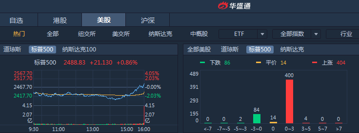 周四,美股低开高走,尾盘快速拉升,标普500涨幅0.86%,道琼斯涨幅1.14%,纳斯达克涨幅0.38%。