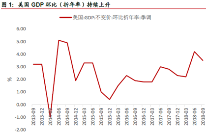 2018年前三季度,美国实际GDP环比折年率分别增长2.2%、4.2%和3.5%,第二、第三季度增速明显超出去年同期水平。