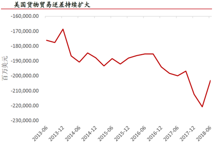 从贸易赤字来看,美国货物贸易逆差持续扩大,至2018年3月,美国贸易逆差至历史高点2208亿美元。