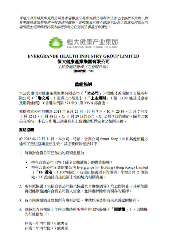 恒大健康:恒大持有32%FF优先股权 并100%持有FF香港