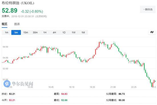 布伦特原油跌破53美元,日内跌0.6%左右,北京时间31日20点过后曾突破54.80美元/桶、创日内新高,日内涨幅一度超过3.4%。