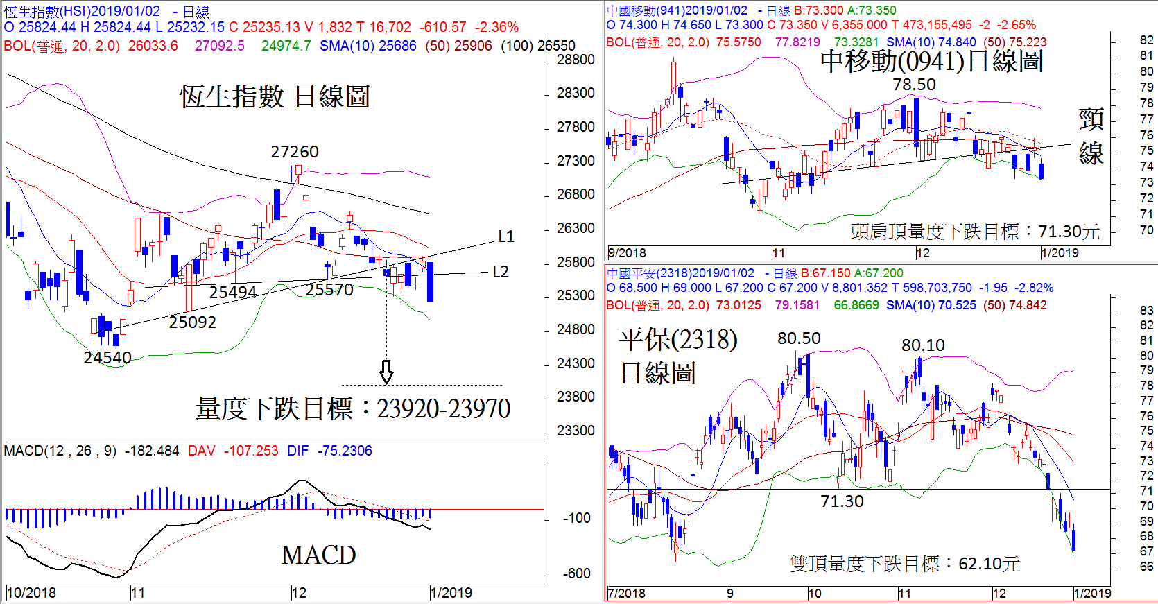 第一,中移動(0941)在12月24日以裂口及大陰燭確切跌穿了「頭肩頂」的頸線,其量度下跌目標為71.30元;