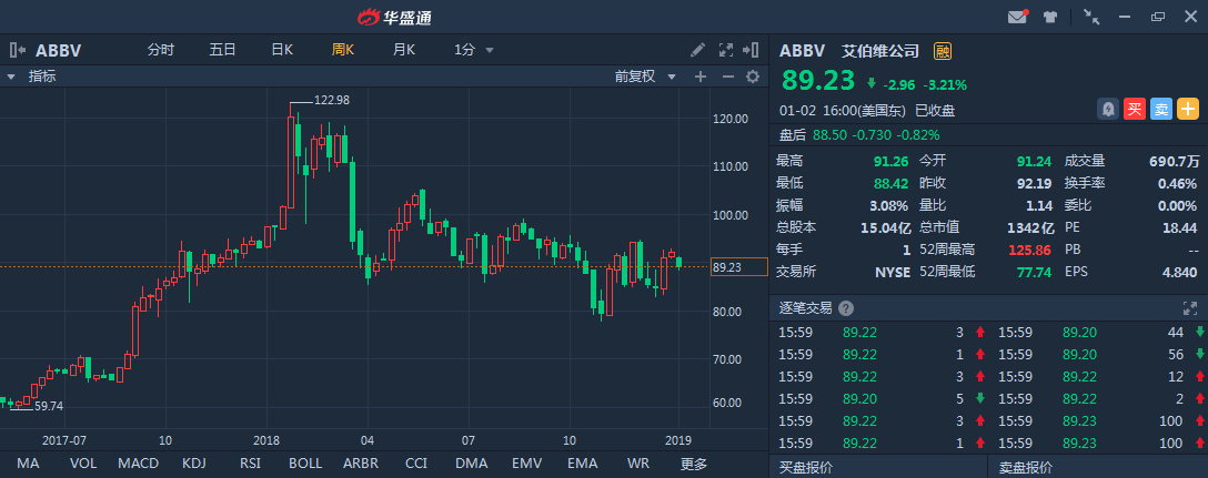 去年12月,美股市场遭遇大跌,艾伯维也不能幸免,股价从历史最高点的123美元下跌超过27%,12月累计下跌2.21%,表现逊于其他制药股。