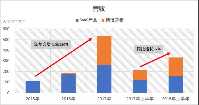 目前微盟营收主要来两大业务 —— SaaS产品和精准营销,2015年、2016年、2017年营收分别为1.14亿元、1.89亿元、5.34亿元,年复合增长率达到116%。