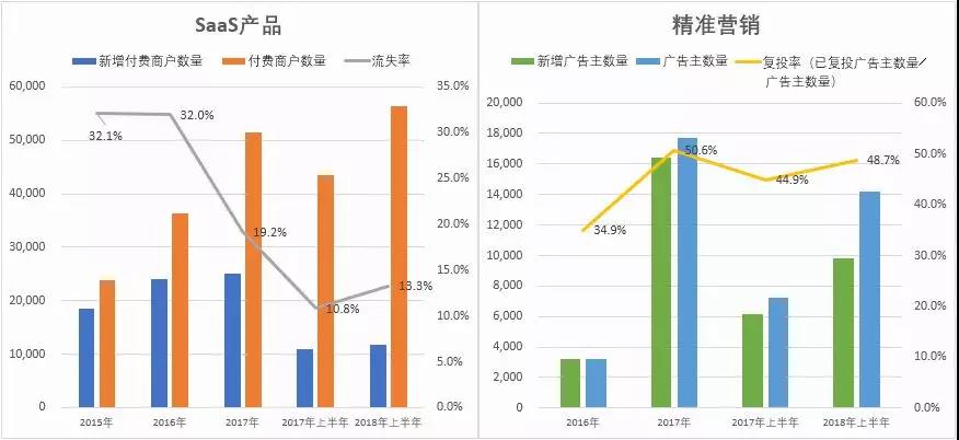 SaaS产品的付费商户数量用2015年23,895家增长至2018年上半年的56,313家,当中的流失率更逐步降低至目前的13.3%,证明了用户黏性在跟随着公司产品转型升级而提高。